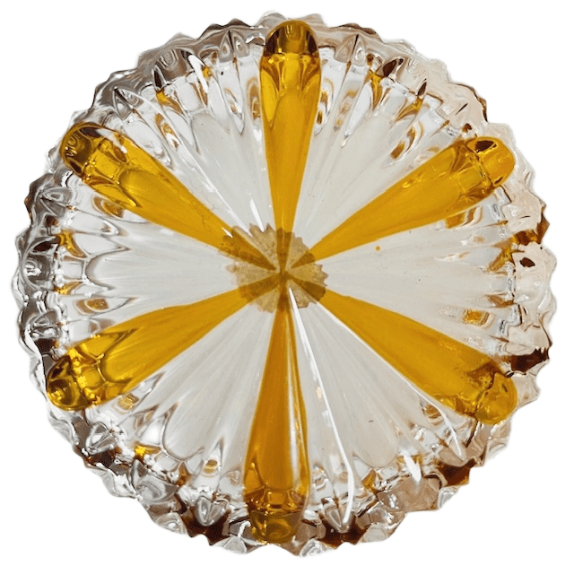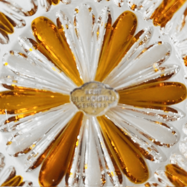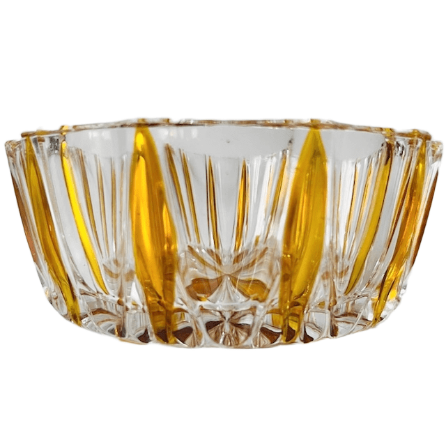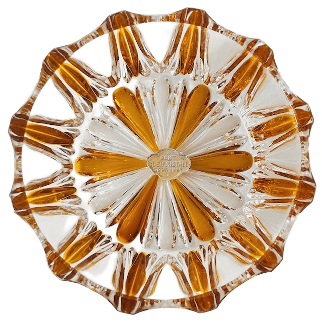 Leuk vintage Bleikristall schaaltje in geslepene amber en transparant kristal uit de jaren 60. Leuk als snoepschaaltje, bonbonnière of opberger voor sieraden. Dit schaaltje is gemaakt van loodkristal dat een prachtige glans geeft.