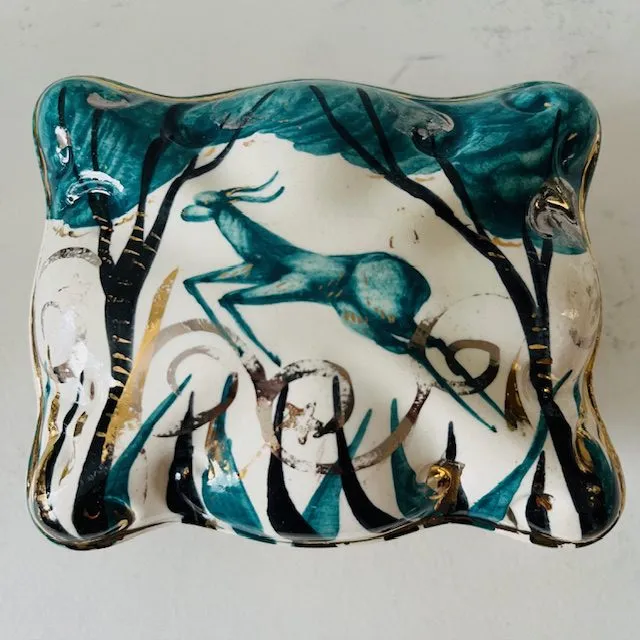 Vintage bonbonnière met hertje erop in turquoise met goud gemaakt van porselein. Deze porseleinen bonbondoos dateert uit de jaren 60.