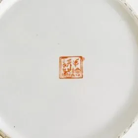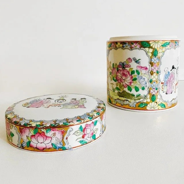 Prachtige vintage Chinese theebus van porselein met handgeschilderde decoratie in pastel tinten en goud.