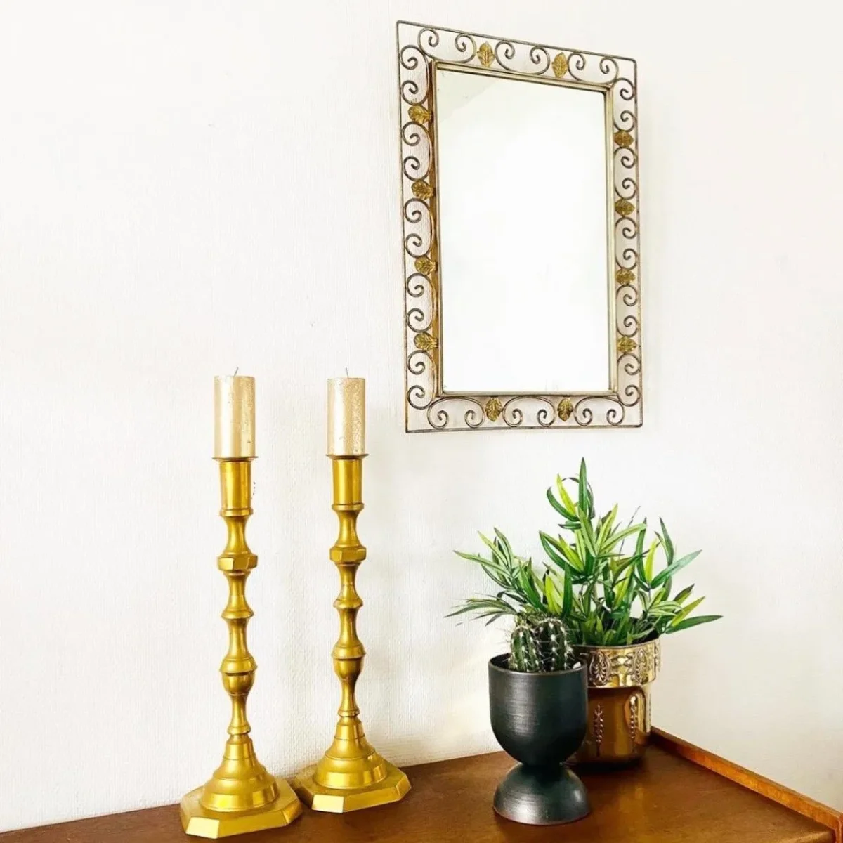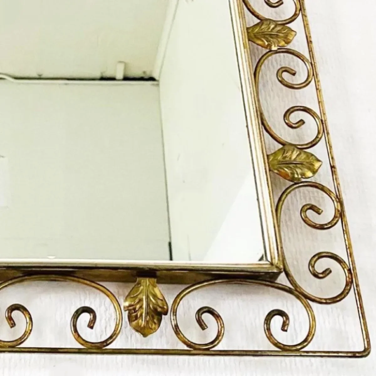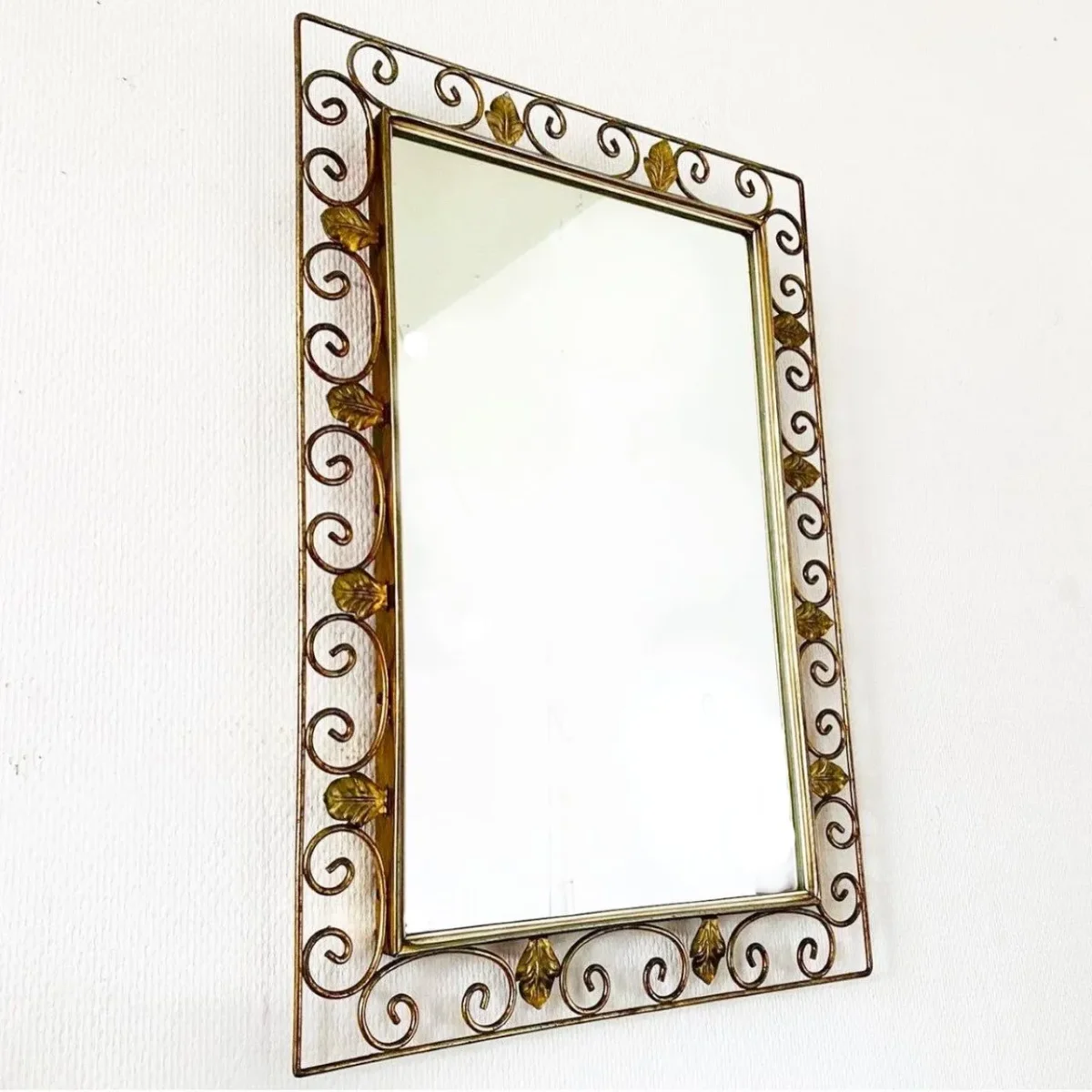 Of het een De Knudt spiegel is, weet ik niet zeker. Deze gouden spiegel heeft in ieder geval de stijlkenmerken van De Knudt spiegels en een prachtig patina. De vintage spiegel is 58,5 cm lang en 40,5 cm breed.