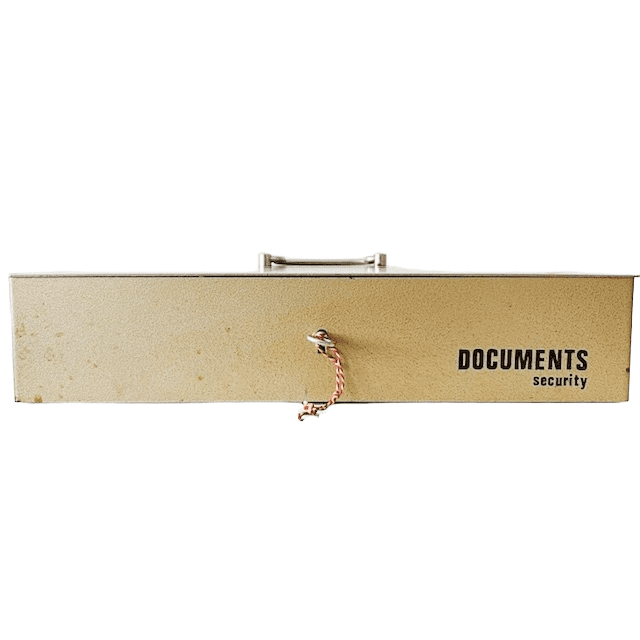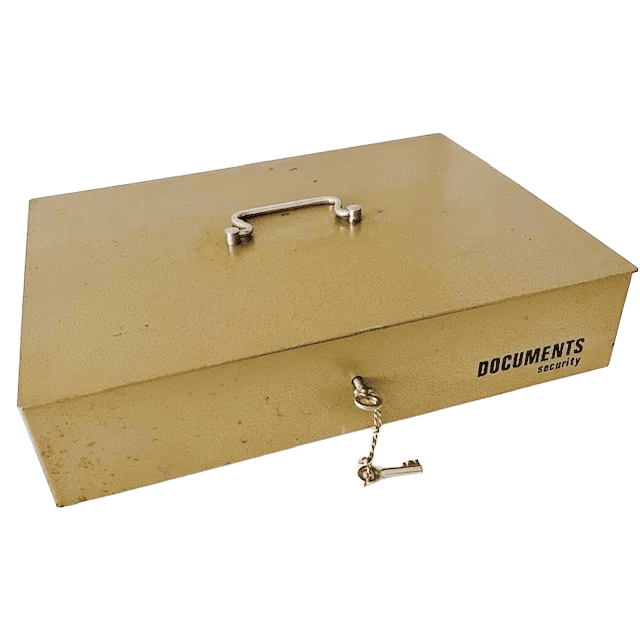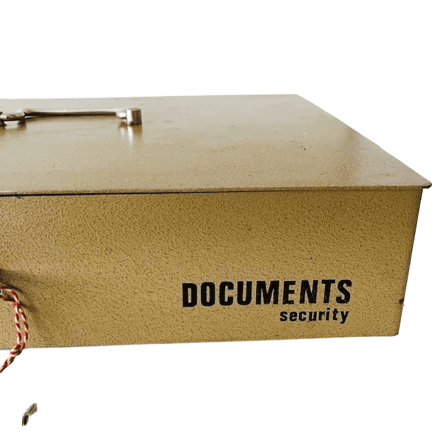 Vintage documentenkluis industriële stalen doos geldkist staal geld box met hendel en sleutel uit de jaren 80. Geschikt voor vertrouwelijke documenten van het hoofdkantoor.