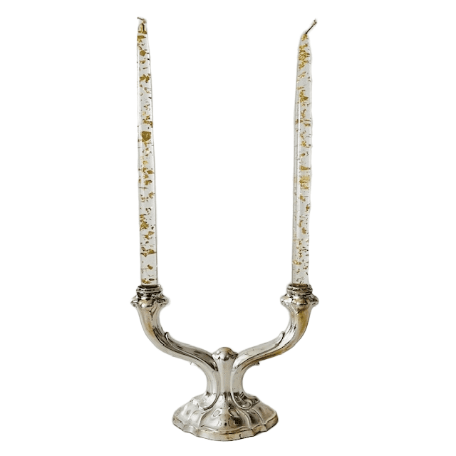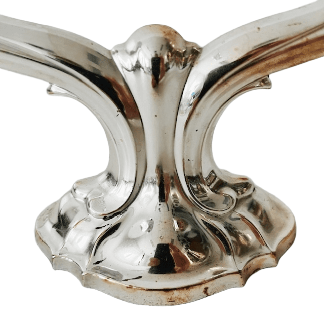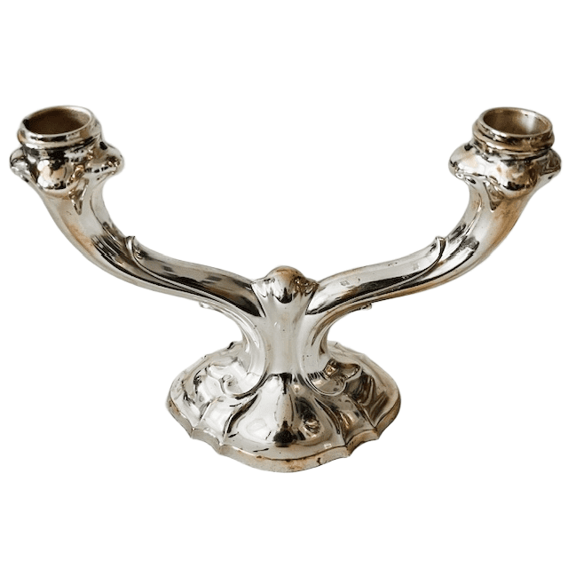 Vintage Duitse Art Nouveau-stijl verzilverde kandelaar met dubbele armen. De kandelaar is gemerkt met Floreat voor Floreat – Metallwerke AG – Stuttgart Verzilvermaker / Metallwarenfabrik.