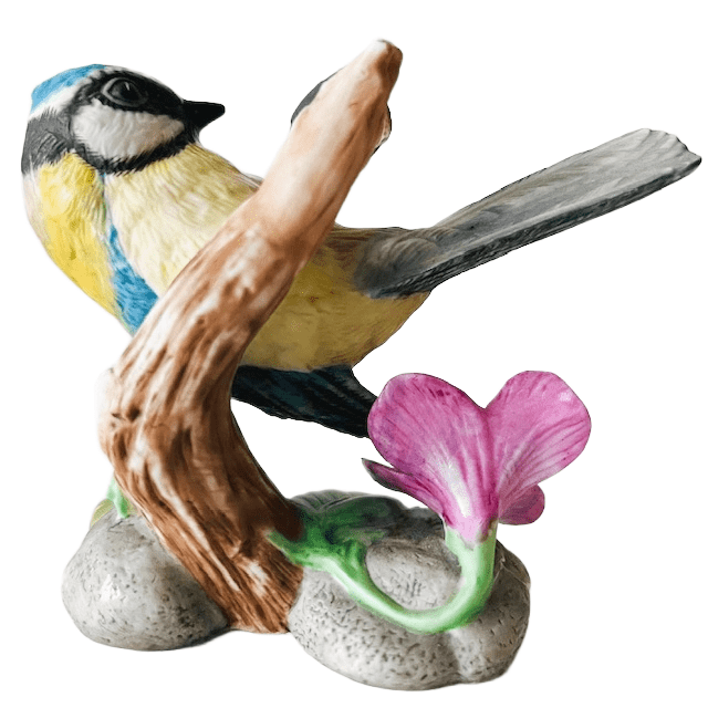 Een prachtig gedetailleerd porseleinen biscuitbeeldje met een opvallende handgeschilderde pimpelmees in groen en een paarse bloem.