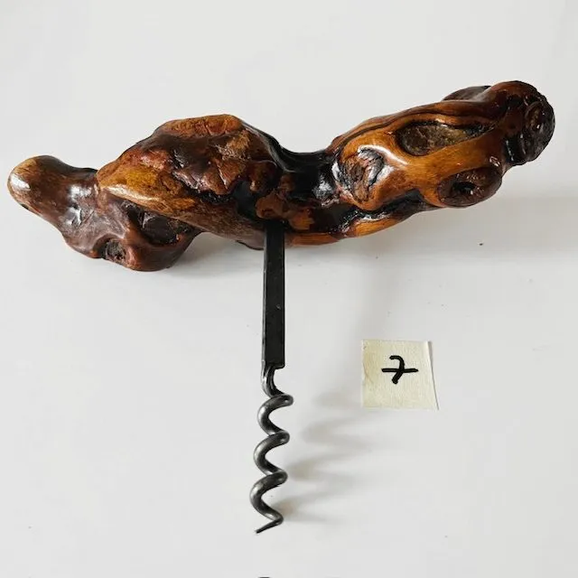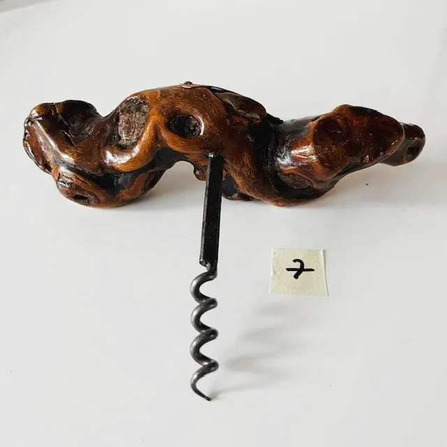 Het tactiele knoestige houten handvat van de kurkentrekker zorgt voor een rustiek en organisch gevoel, waardoor het een praktisch onderdeel van de wijngeschiedenis is en een geweldige toevoeging aan de collectie van elke wijnliefhebber.