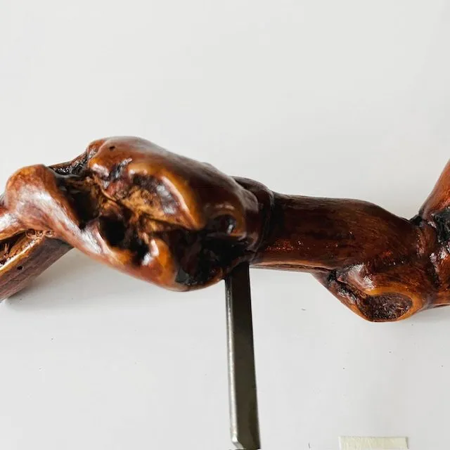 Het handvat is gemaakt van natuurlijk, gevormd hout van een wijnstok.