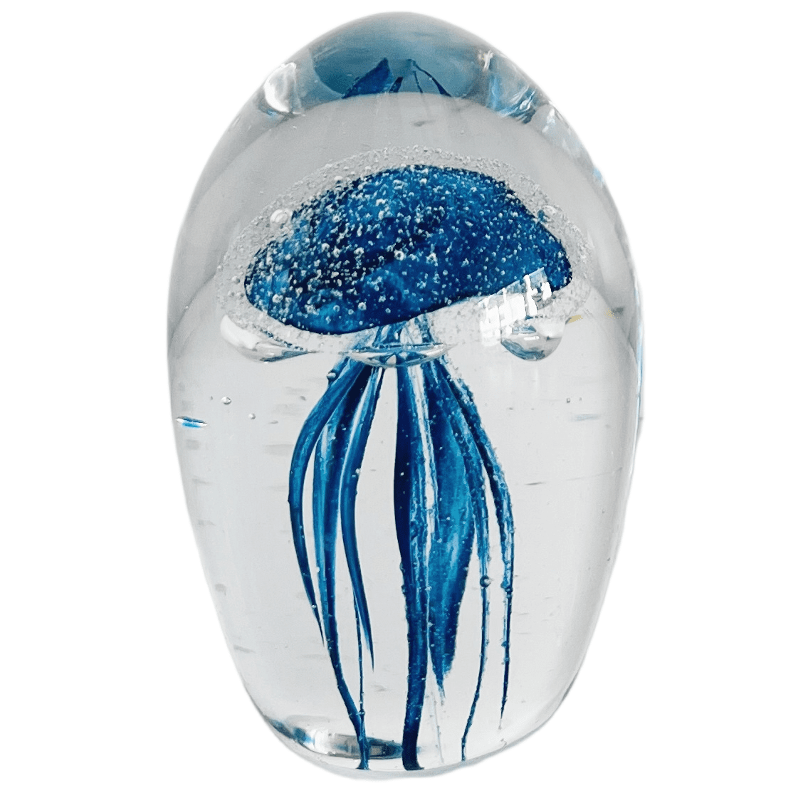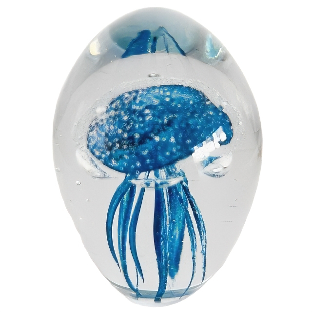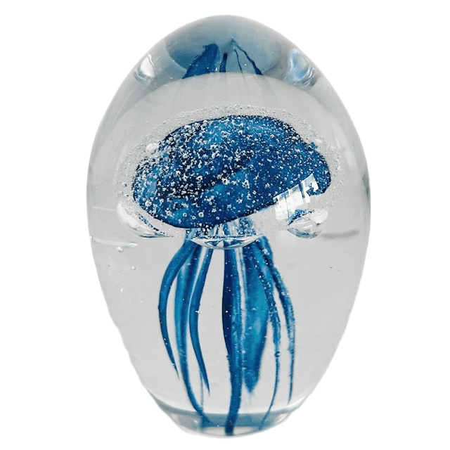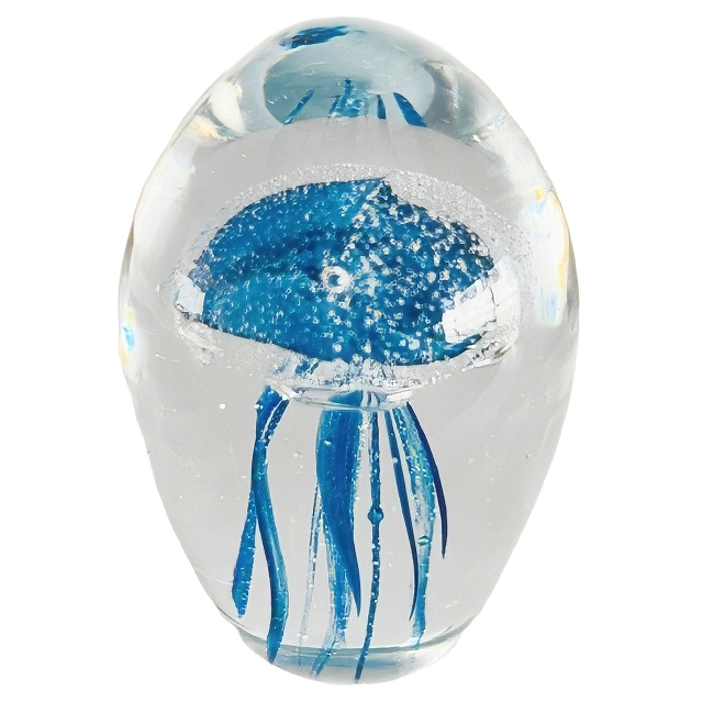 Bijzondere vintage glazen Presse papier met een blauwe kwal erin. Dit Hollywood Regency briefgewicht is handgeblazen en prachtig voor op je bureau.