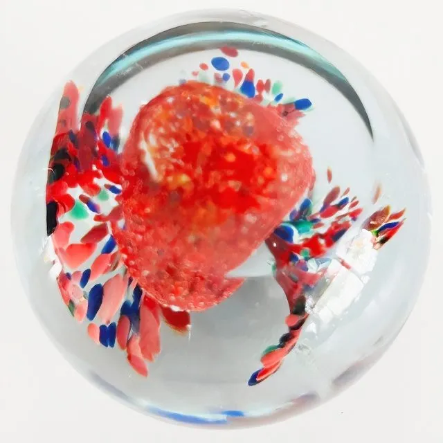 Grote vintage bolvormige presse-papier met kleurrijke confetti en bloemachtige vormen.