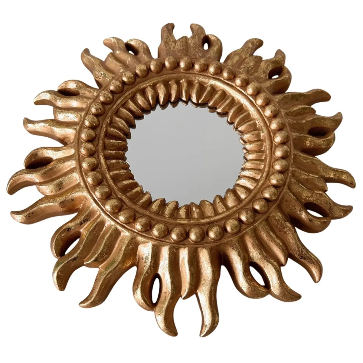 Deze vintage gouden sunburst zonnespiegel uit de jaren 80 past perfect in een Hollywood Regency interieur. De gouden spiegel heeft een gouden omlijsting van hout / resin. Het zonnespiegeltje heeft een doorsnede van 26 cm en is 3 cm diep.
