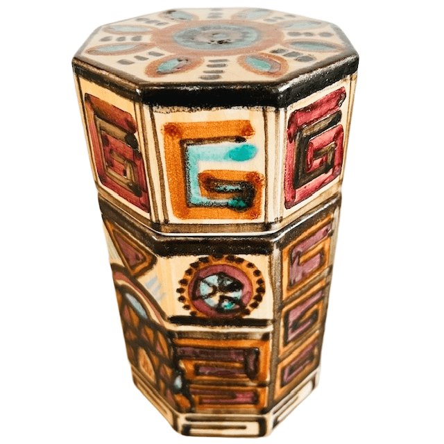 Vorm: Achthoekige (octogonale) cilinder met deksel. Deze pot is 16,6 cm hoog, 9 cm lang en 9 cm breed. 17 cm breed en in goede vintage staat.