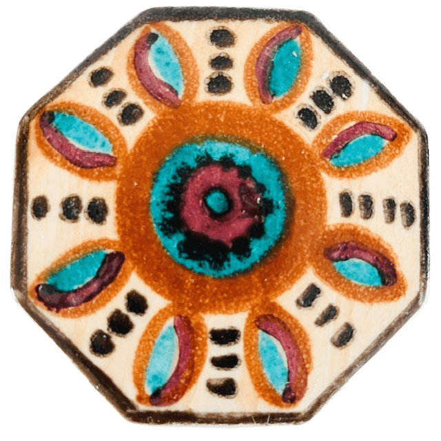 Deze keramische vaas of pot met de hand heeft een handbeschilderd decor in sprekende kleuren met geometrische vormen.