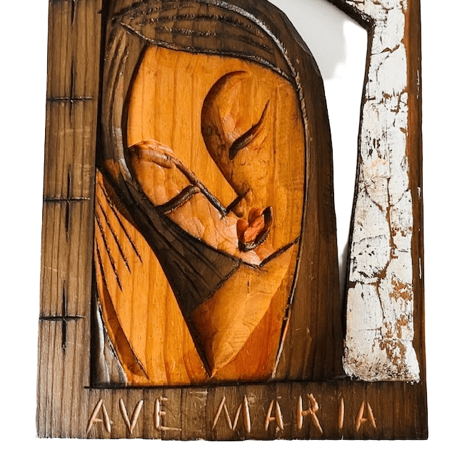 Vintage Handgesneden maagd Maria houten wanddecoratie. Deze religieuze wandplaquette is waarschijnlijk gemaakt in Mexico in de jaren 70.