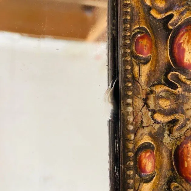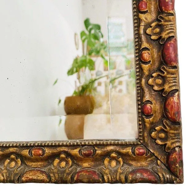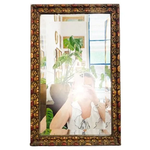 Toffe vintage houtsnijwerk spiegel in warme tinten met een vleugje goud uit de jaren 30. Vermoedelijk uit Italië Deze spiegel heeft facet geslepen spiegelglas en heeft een massief houten gestoken lijst.