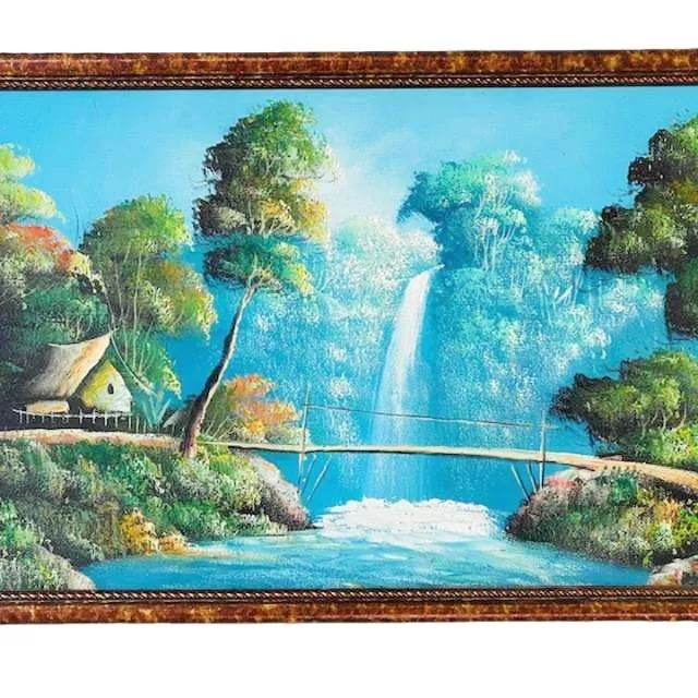 Vintage XL Indonesisch olieverf schilderij met een prachtig landschap met o.a. een waterval. Het schilderij is 83 cm lang, 48,5 cm hoog en 2 cm diep. Het schilderij is in goede vintage staat en voorzien van de originele houten lijst.