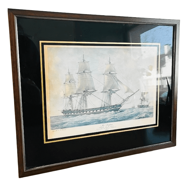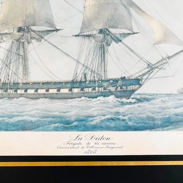 Prachtig ingelijste maritieme lithografie van G. Roux met een portret van het Franse fregat schip “La Didon” uit 1828. Dit ingelijste boot schilderij is vermoedelijk in de jaren 60 gemaakt. Het heeft een prachtig zwart glazen passe-partout met gouden randje.