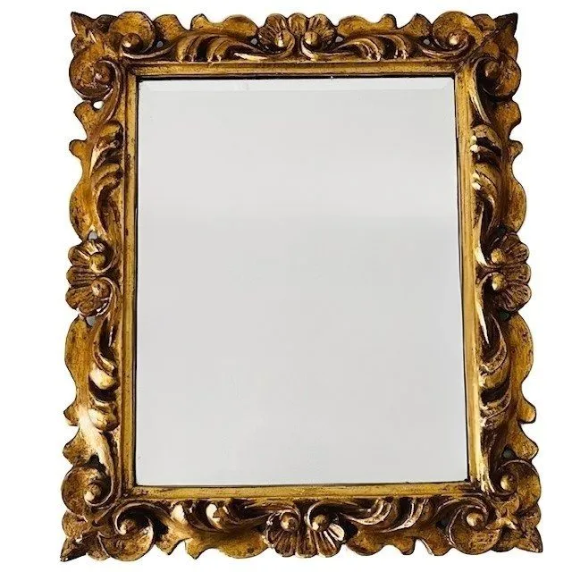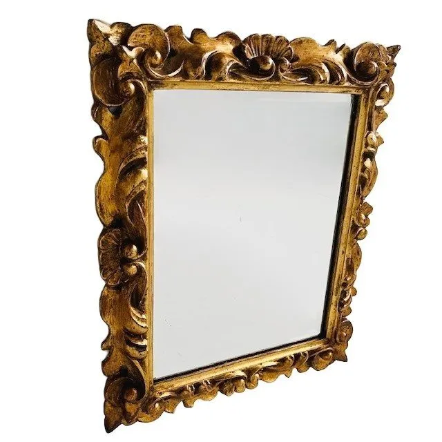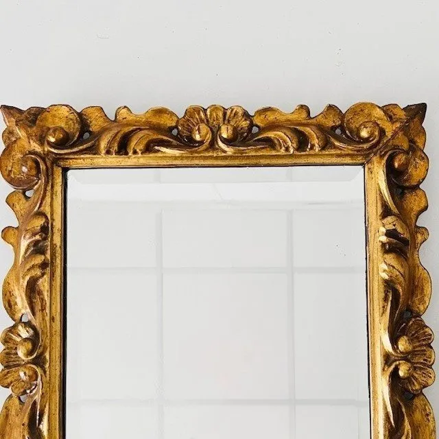 Vintage Italiaanse barok vergulde gouden rechthoekige facet geslepen spiegel met prachtig verguld houtsnijwerk lijst uit de jaren 60. Deze spiegel is in Florentijnse stijl en in zeer goede staat.