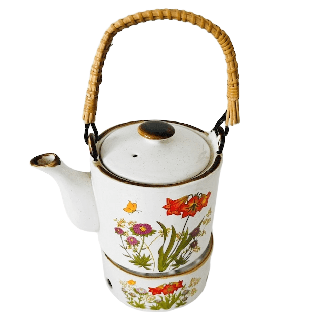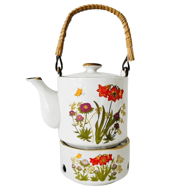 Vintage keramische theepot en warmer met wilde bloemen decoratie rustiek uit de jaren 70.