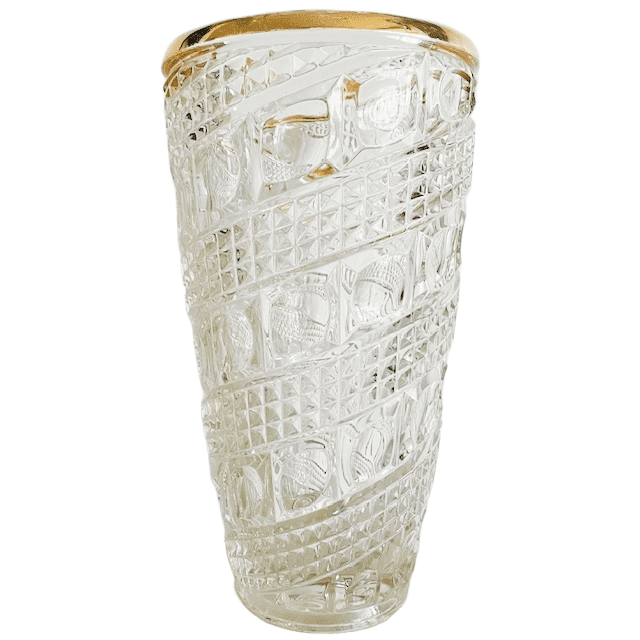 Vintage kristal Hollywood Regency kristallen vaas met goud vergulde rand uit de jaren 70. De vintage kristallen vaas is in uitstekende vintage staat.