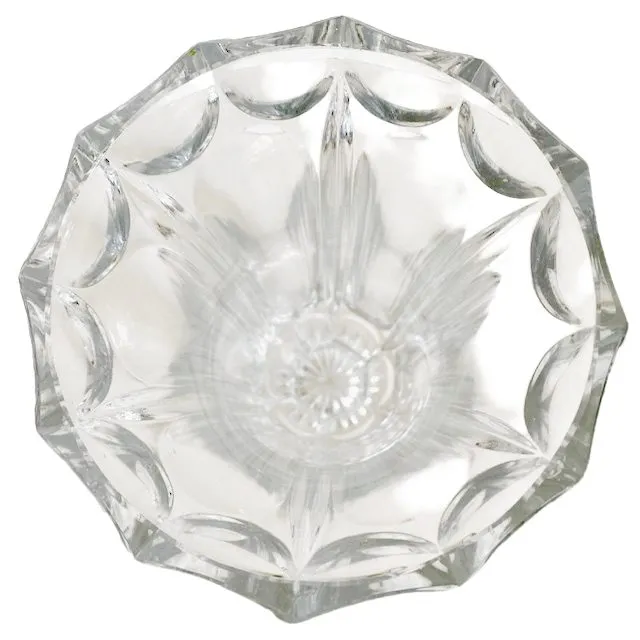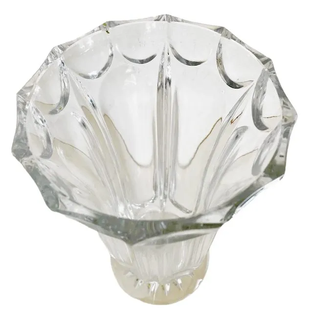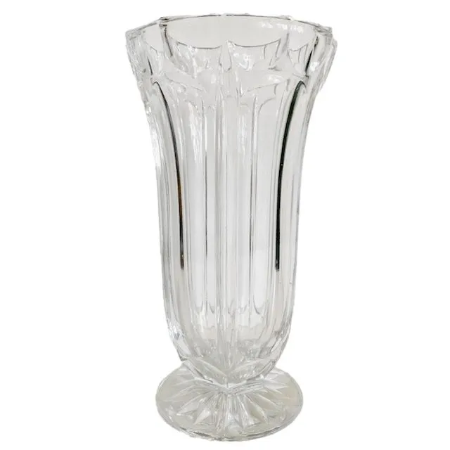 Schitterende vintage kristallen vaas op voet met artdeco motieven 1950. Deze prachtige oude kristallen vaas op voet heeft dikwandigb rede facetten en ribben en een voet met ingeslepen ster.