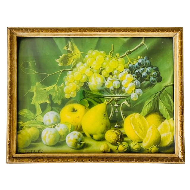 Het vintage lijstje met fruit lithografie 1940’s is 26 cm hoog, 20 cm breed en 1 cm diep. Het is aan de onderzijde gesigneerd met de naam Marlehetti.