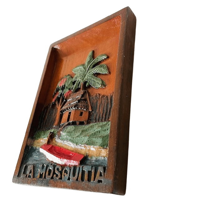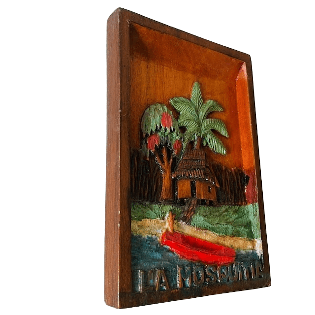 Geweldig vintage massief houten schilderijtje van La Mosquitia, handgestoken. Dit houtsnijwerk schilderijtje is een reliëfkunstwerk dat handmatig uit hout is gesneden en gedeeltelijk is gekleurd. Het laat een hut zien met een rieten dak, omringd door bomen en een waterweg met een rode boot. Aan de onderzijde van het paneel is de tekst “LA MOSQUITIA” gesneden.