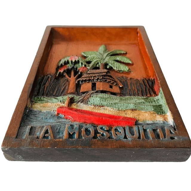 “La Mosquitia” verwijst naar een gebied in Honduras en Nicaragua, dat beroemd is om zijn uitgestrekte bossen en lokale culturen. Dit type houtsnijwerk behoort tot de volkskunst en kan zijn afkomstig uit deze of soortgelijke tropische regio’s.