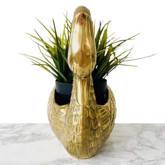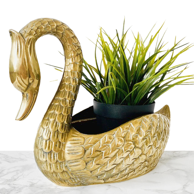 Deze prachtige vintage messing zwaan bloempot uit de jaren 50 is een waar Hollywood regency kunstwerk. De mid-century messing is voorzien van kunststof inzetstuk waar je een plantje in kunt zetten.