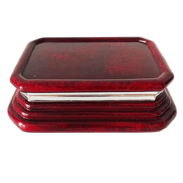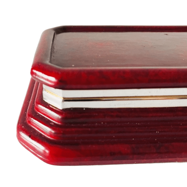Deze doos wordt vaak gebruikt als sieradendoos voor mannen. Het doosje heeft een prachtige kwaliteit rood gemarmerd leder en een goud verguld scharnieren deksel. Perfect voor de kaptafel van elke heer om manchetknopen, een horloge, dasspelden, muntjes etc. in op te bergen. Onderaan gemerkt met: Florence .design (zie foto). In zeer goede staat.
