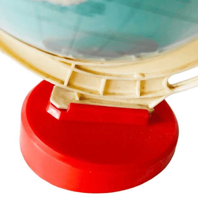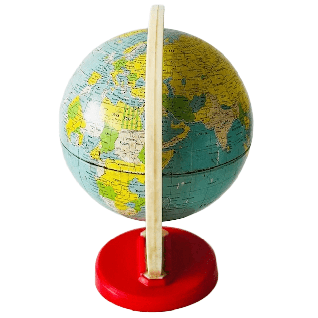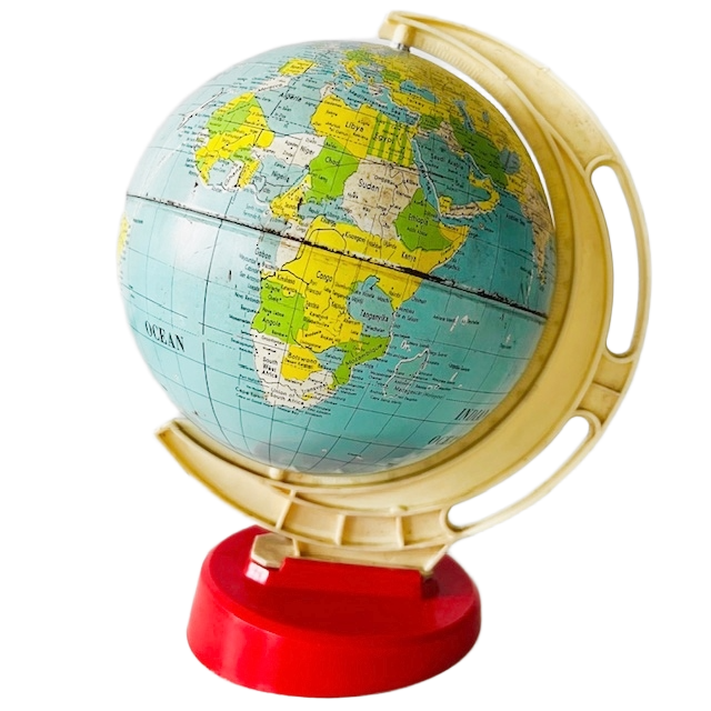 Vintage mid-century retro globe wereldbol uit de jaren 70. in rood en beige kunststof Leuk voor in een studeerkamer of kinderkamer. De vintage wereldbol is in goede vintage staat. en heeft een mooi messing detail aan de bovenzijde. De globe is 23 cm hoog en heeft een doorsnede van 20 cm en is 16 cm diep.