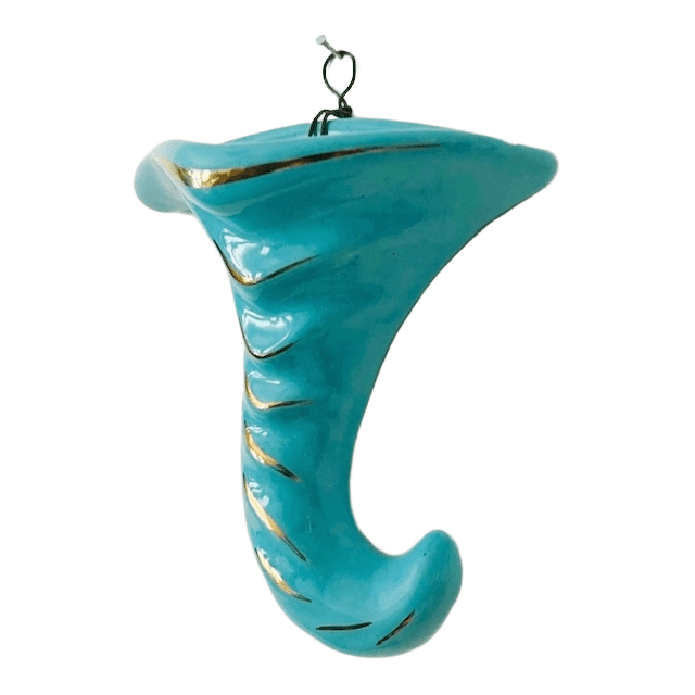 Vintage mid-century keramische hoorn muurvaas keramiek wand vaasturquoise uit de de jaren 60. De blauwe wandvaas in de vorm van een hoorn is in uitstekende vintage staat