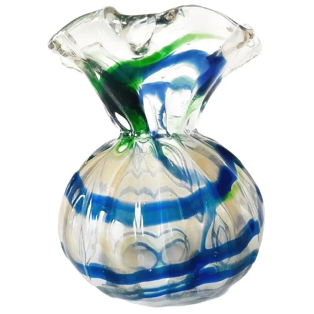 Leuk vintage mid-century Murano glas helder vaasje met blauwe en groene zweem erin uit de jaren 50. Dit vaasje doet een beetje denken aan een snoepverpakking.