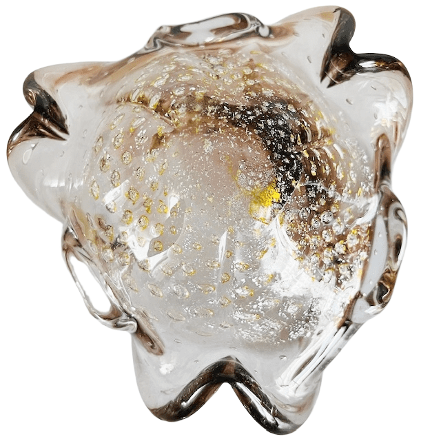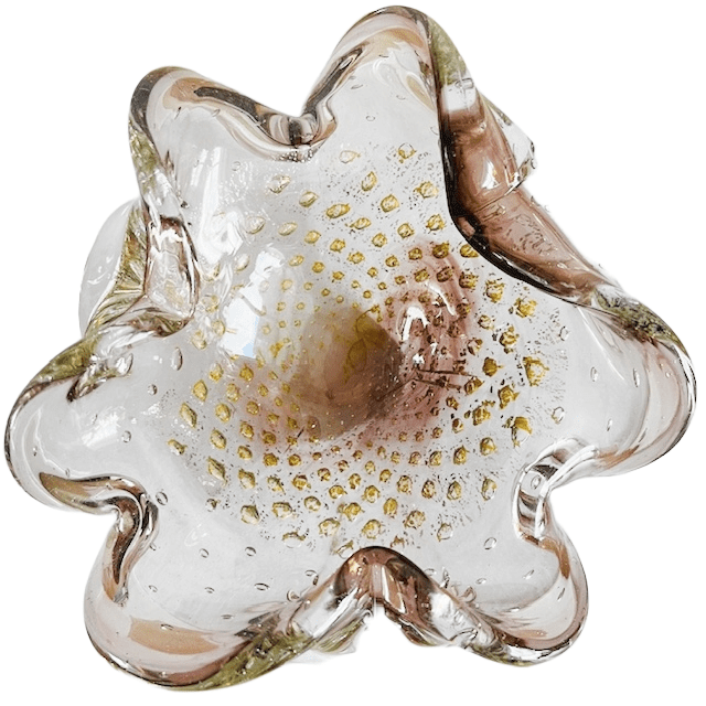 Handgemaakt in Murano (Italië) en vernoemd naar Barovier & Toso. Het is een klassiek voorbeeld van de ‘a bolle’-techniek: met gelaagd glas, luchtbellen en goud aan de randen van het blad. De vakmanschap en de verfijning zijn echt opmerkelijk en dragen bij aan verschillende decorstijlen, variërend van modern tot eclectisch.