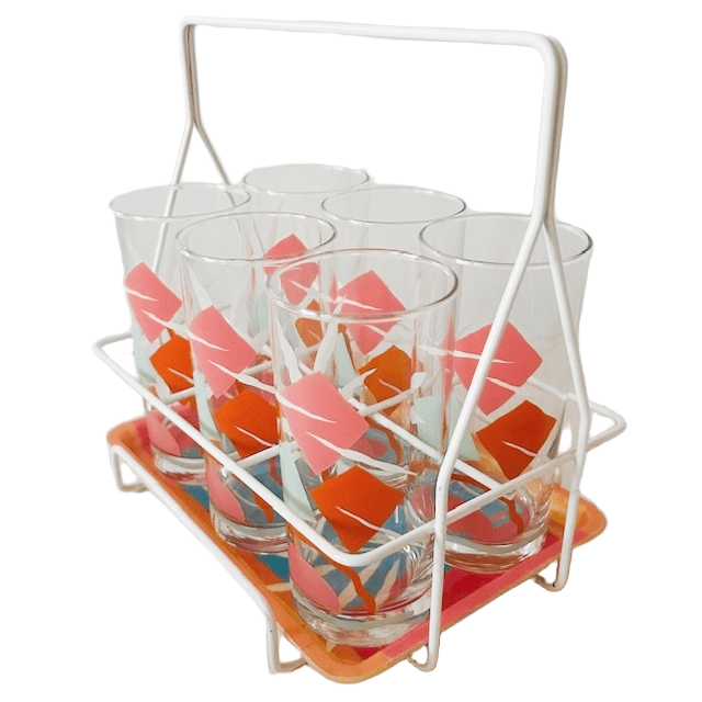 Coole vintage Mid-century retro glazen rekje uit de jaren 60’s met 6 limonade glazen. Bijzonder is dat de houder ook een vrolijk dienblaadje heeft.