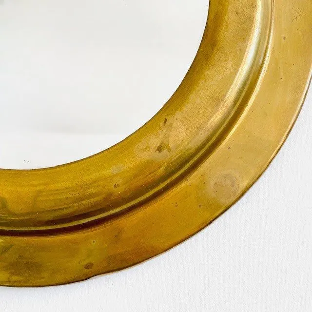 Vintage mid-century ronde messing spiegel met mooie ouderdomspatine uit de jaren 60. Deze vintage wandspiegel heeft een prachtige messing rand en is goede vintage staat.