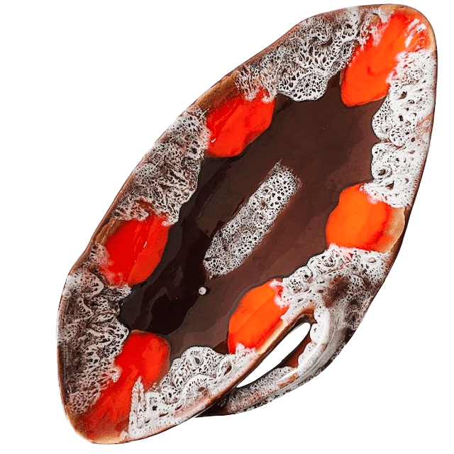 Gave Vintage mid-century Vallauris fruitschaal in oranje & bruin keramiek, gemaakt in de jaren 60 / 70, helemaal in fat lava stijl.