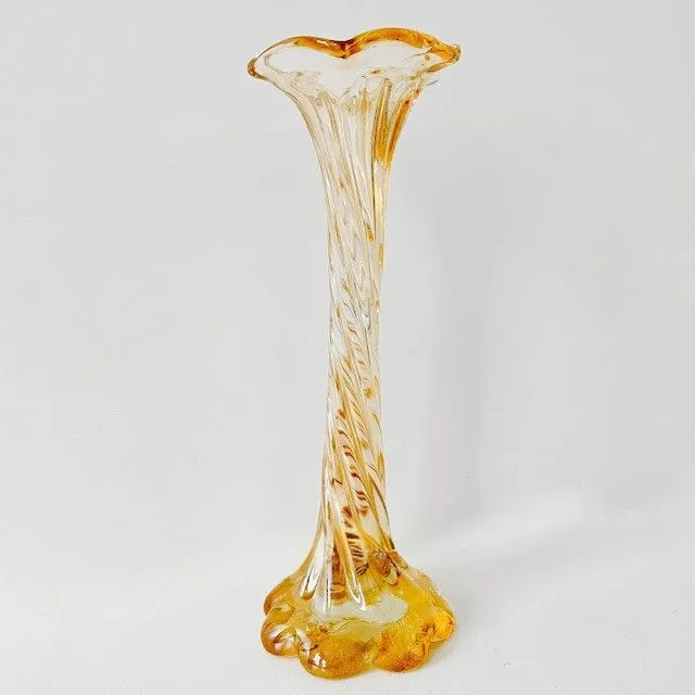 Lief vintage gedraaid Murano vaasje in zalmroze iriserend glas. Dit glazen vaasje is superleuk om een losse bloem in te zeten. De vintage glazen Murano vaas is 23 cm hoog en heeft een doorsnede van 11,5 cm. Het vaasje is in uitstekende vintage staat.