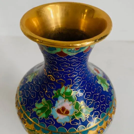 Prachtig vintage Oosterse boho cloisonne vaas met als hoofdkleur blauw en schitterende bloemen en patronen uit de jaren 1980’s