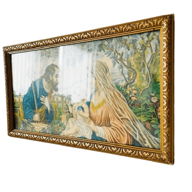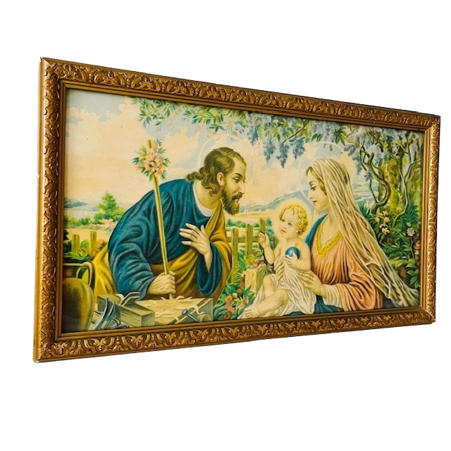 Vintage religieuze lithografie met de Heilige Familie Maria, Jozef en baby Jezus. Dit schilderij is gemaakt naar het werk van Giovanni The holy Family. Het dateert uit de jaren 40 en heeft een mooi gouden lijstje van hout uit dezelfde periode. De kleurrijke lithografie is 23 cm hoog, 40,8 cm hoog en 1,5 cm diep.