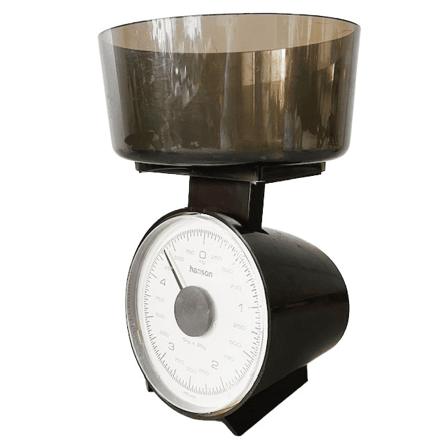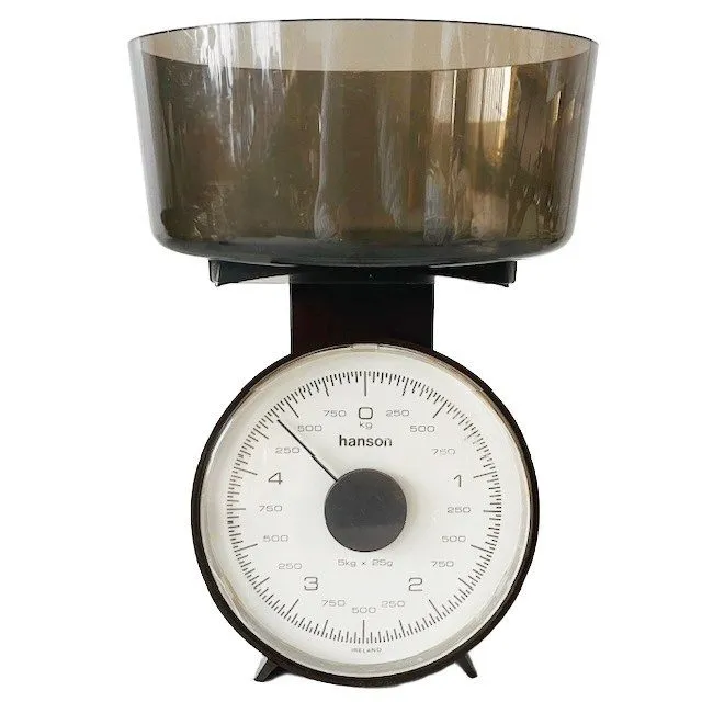 Toffe vintage retro weegschaal Hanson in bruin en beige uit de jaren 70.