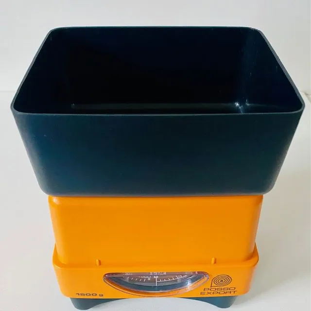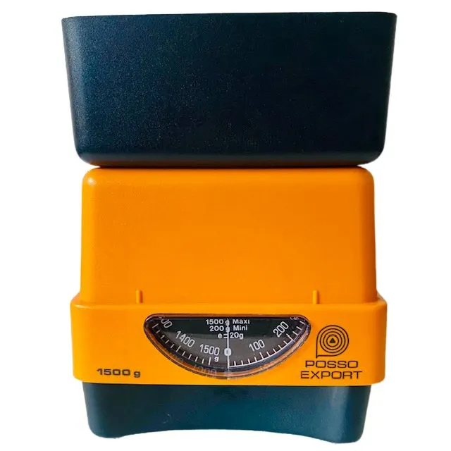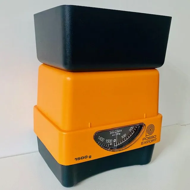 Toffe vintage retro Pooso Export weegschaal in matzwart en oranje kunststof.