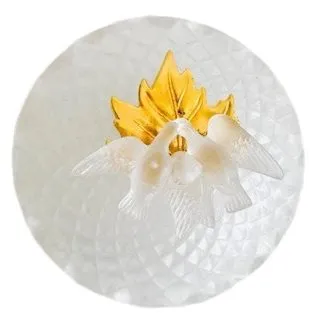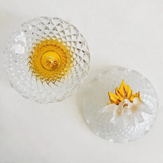 Zeer mooie elegante vintage rococo bonbonnière van kristal em messing met twee vogels (duiven) op het deksel. Dit bonbonschaaltje heeft een mat kristallen deksel met bovenop een duif. De onderzijde is van geslepen kristal en heeft een messing rand. De kristallen schaal is 13 cm hoog, 10,5 cm breed en 7,5 cm diep.