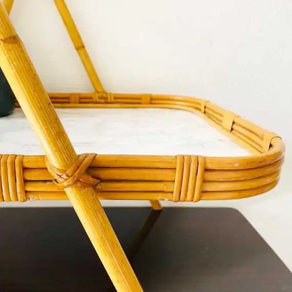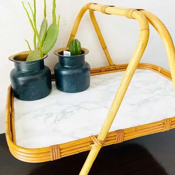Dit rotan dienblad uit de jaren 70 70is uiteraard geschikt om lekker ontbijt op bed 🥐 te serveren.Maar ook supertof om als plantenstandaard 🌿🌱☘️ te gebruiken.Het dienblad is voorzien van nieuwe marmerfolie.Het vintage boho dienblad is 51,5 cm lang, 38,5 breed en 42,5 cm hoog.