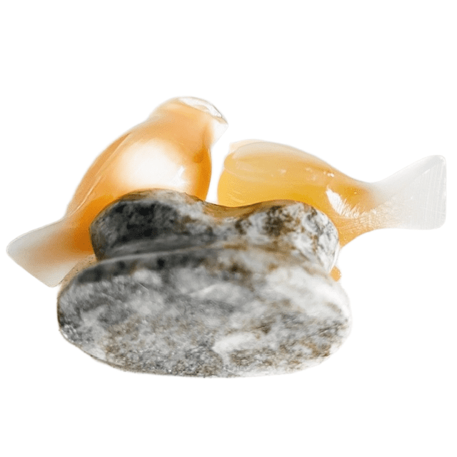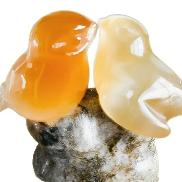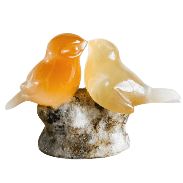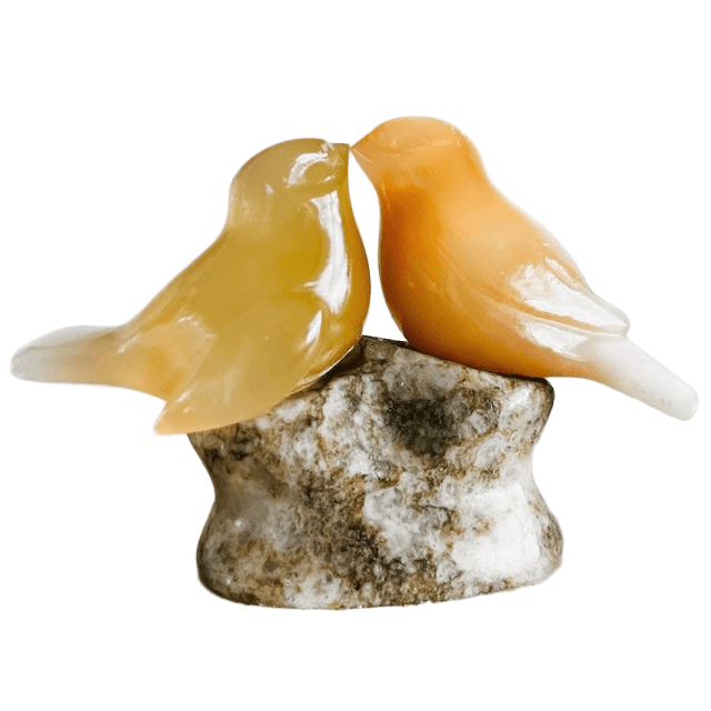 De vogels zijn vervaardigd uit doorschijnend amber- of perzikkleurig seleniet.