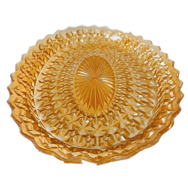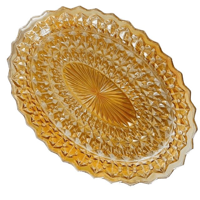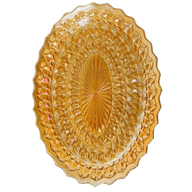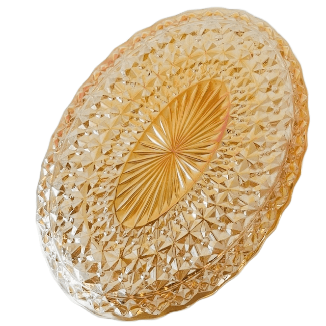 Jeannette, vakantie, knopen en strikken, goudsbloem, depressieglas, ovaal, schotel, iriserend, geperst glas, jaren 1940