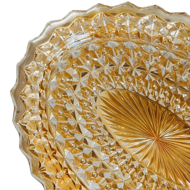 Vintage schaal Jeannette Holiday van glas met Knopen, strikken en goudsbloemen met een iriserend finish uit de jaren 40.