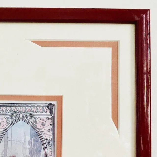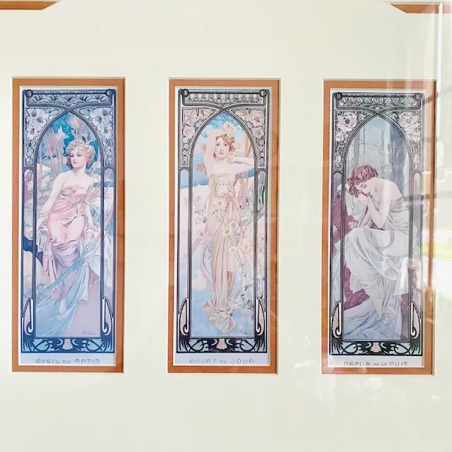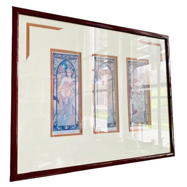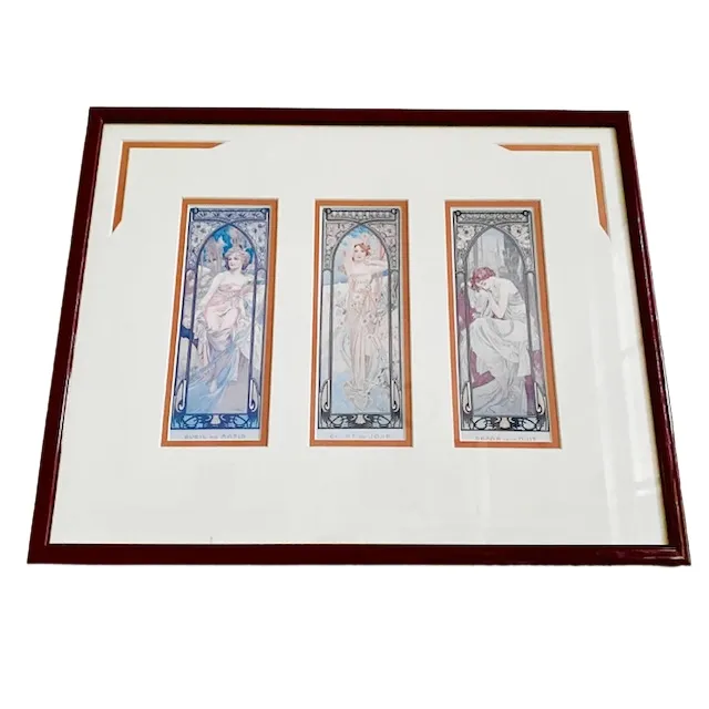 Mooi vintage schilderij met drie ingelijste prenten van Alphonse Mucha in een prachtig passe-partout. Bijzonder is dat er extra uitsnedes in de passe partout als decoratie. Het schilderij is 44 cm lang en 35,5 cm hoog en in goede vintage conditie.