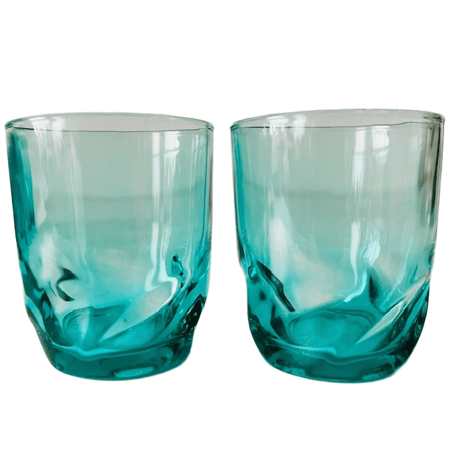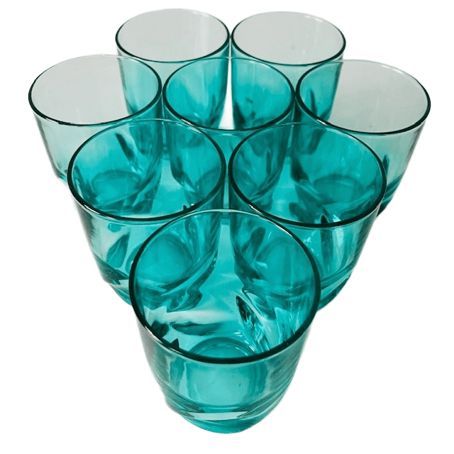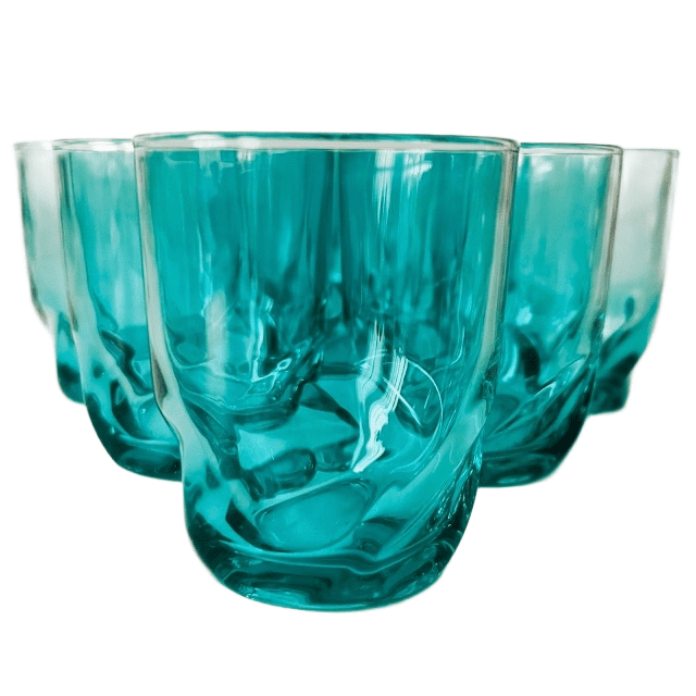 Vintage set van 8 gedraaide glaze in een mooie blauw turquoise kleur, geproduceerd door Luminarc Arcoroc in de jaren 70.
