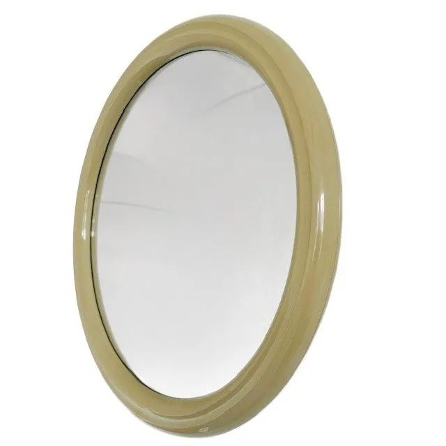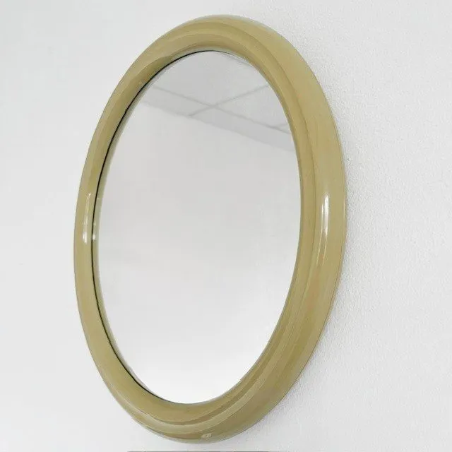 Toffe space age ronde spiegel in prachtig beige, rechtstreeks uit de jaren 60. De retro spiegel is in goede vintage staat. De ronde spiegel heeft een doorsnede van 38 cm en is circa 3 cm diep.