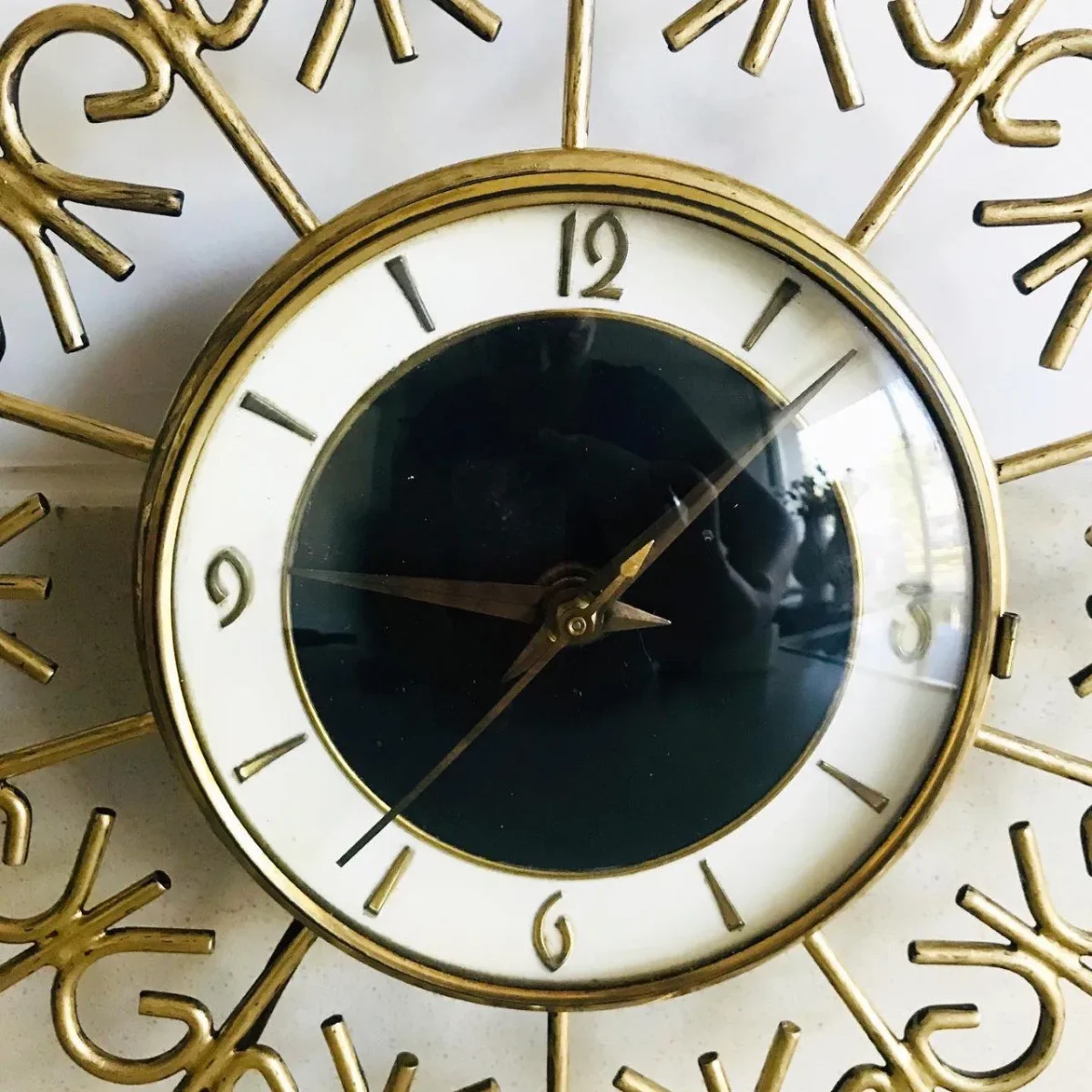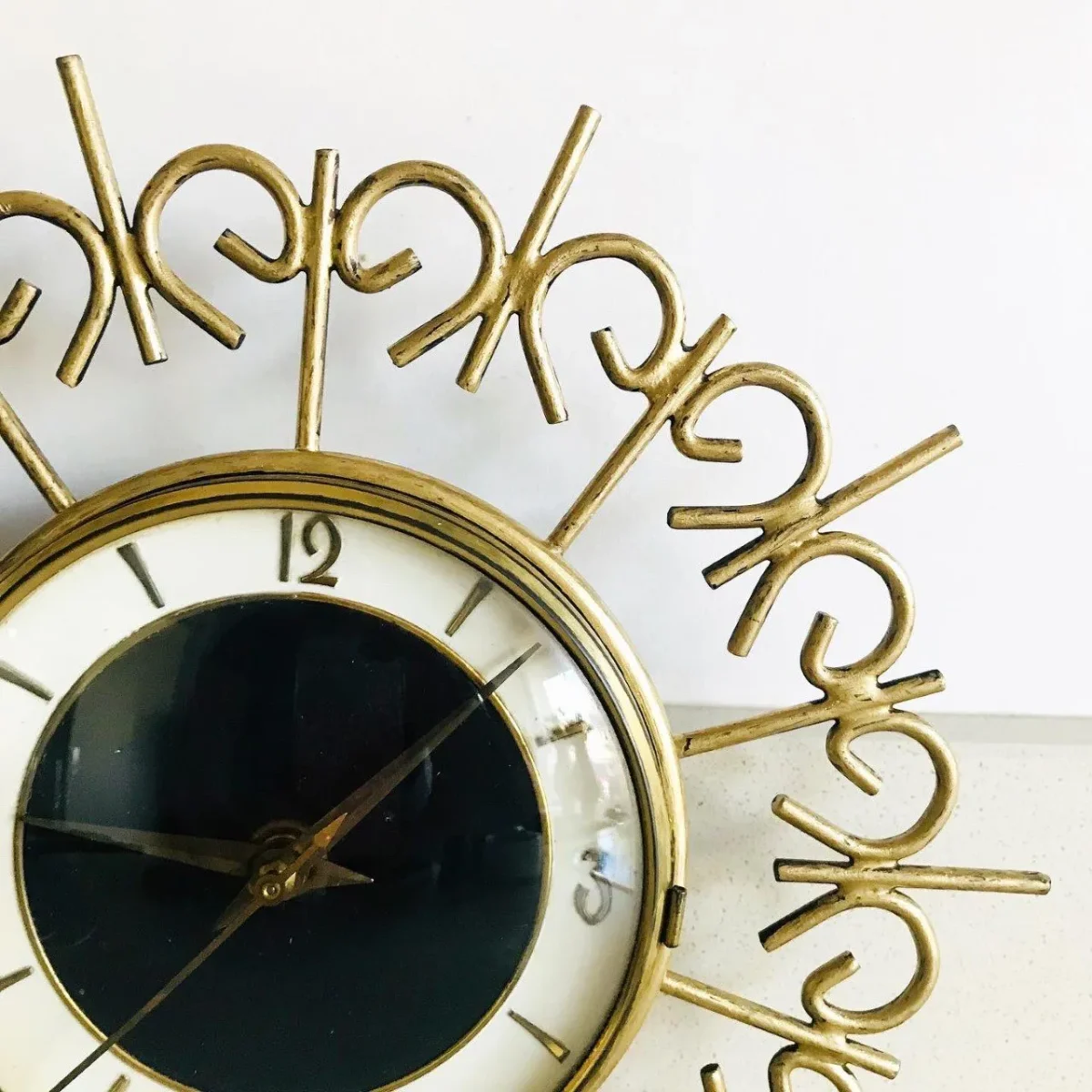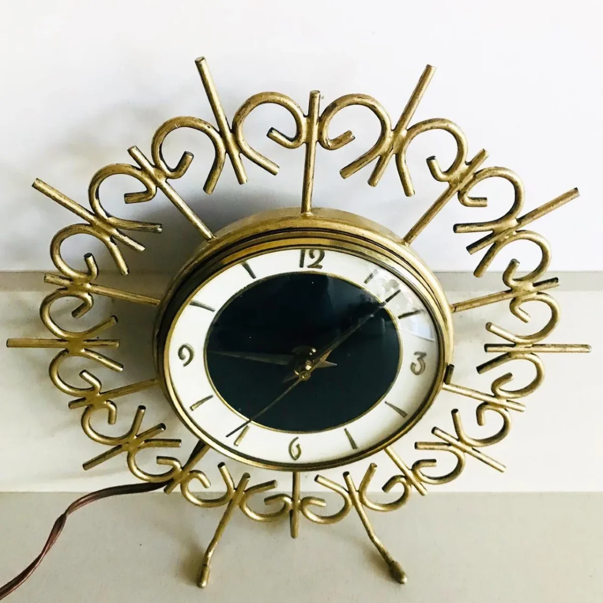 Leuke vintage tafelklok in de vorm van een zon uit de jaren 50. De klok is door ons goud gemaakt om een extra hollywood regency tintje te geven. De klok heeft een doorsnede van 26 cm.