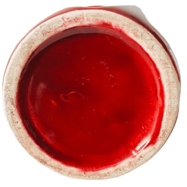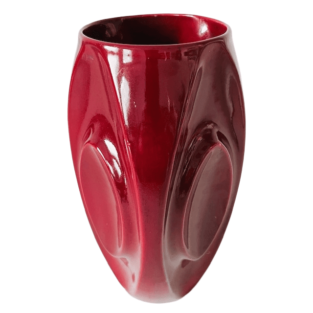 Toffe vintage vaas kersenrood keramiek artdeco stijl uit de jaren 50. De vaas is in goede vintage staat en 26,4 cm hoog met een doorsnede van 16 cm.