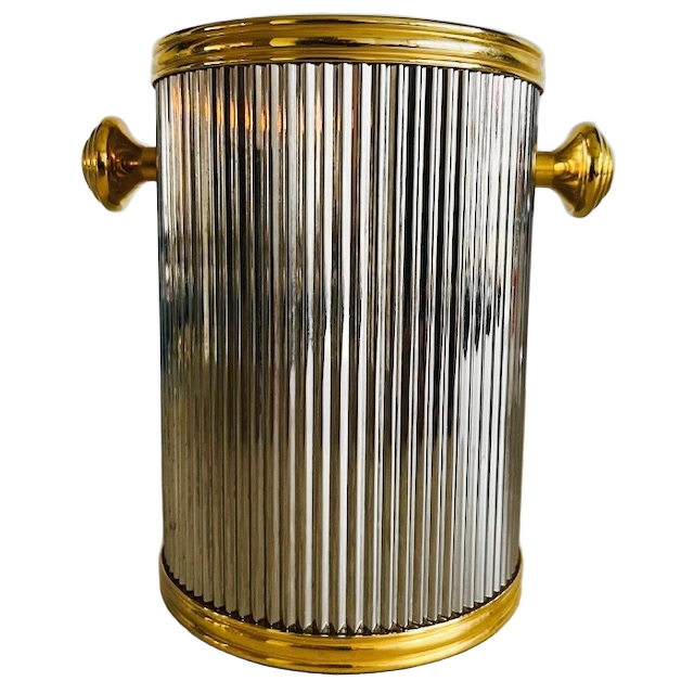 Vintage verzilverde wijnkoeler, helemaal in Hollywood Regency stijl uit de jaren 70. De drankjes koeler is gemaakt van metaal en kunststof en heeft een luxe uitstraling.